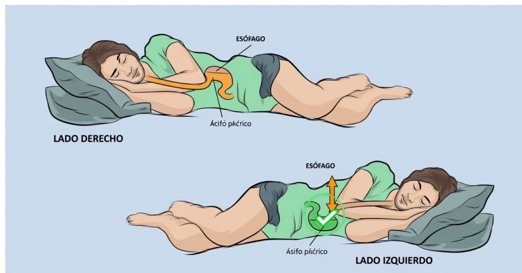 Diversos estudios han observado que acostarse sobre el lado izquierdo ayuda a reducir estos síntomas, mientras que el lado derecho tiende a intensificarlos. Por ello, quienes sufren reflujo suelen beneficiarse al modificar su postura de sueño.