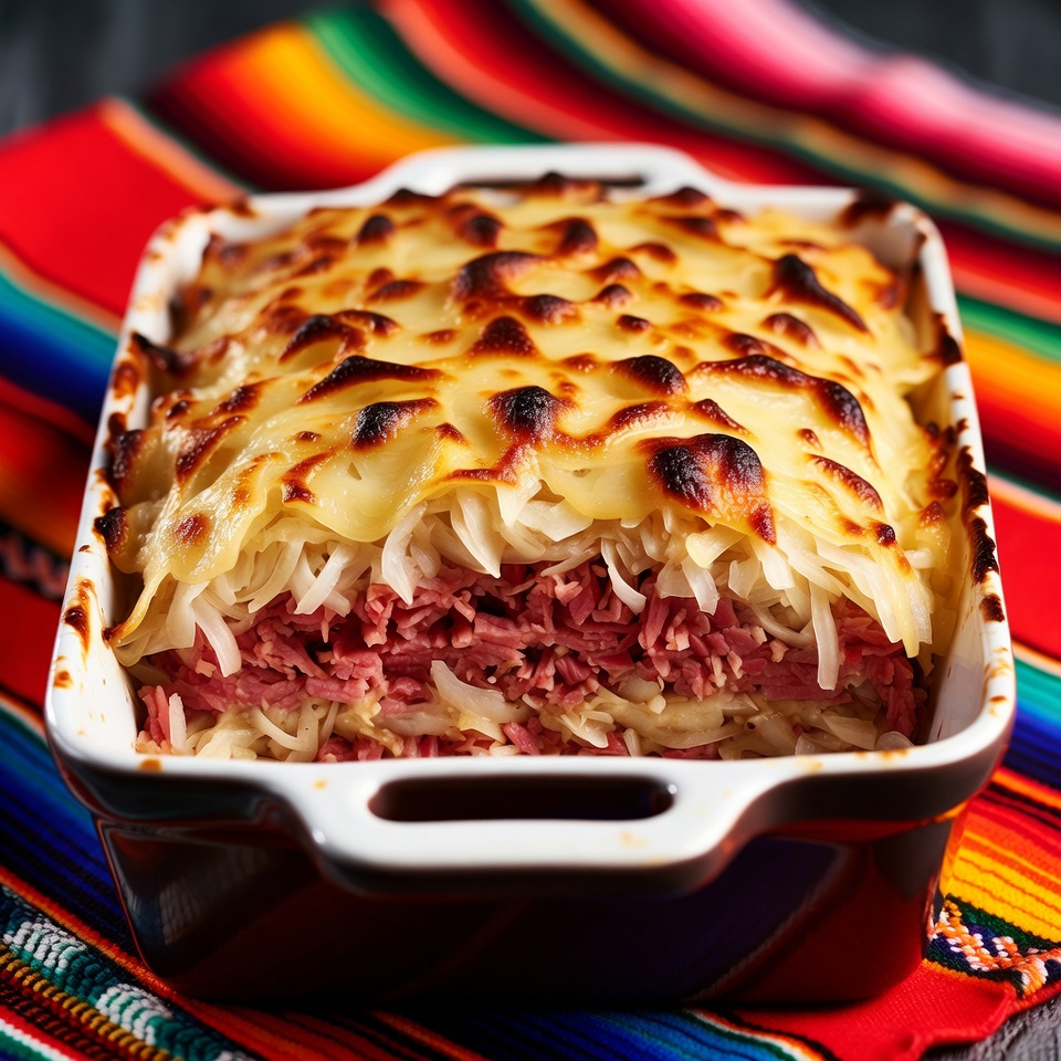 Reuben al Horno con Capas de Carne en Salmuera, Chucrut y Queso Suizo